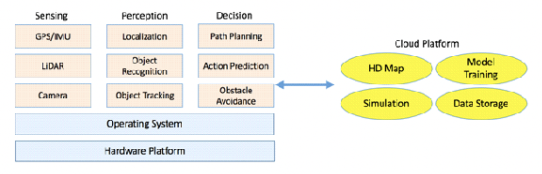 总的说来,无人驾驶系统主要由三部分组成:算法端、车端和云端。其中算法端包括传感器、感知和决策等智能关键步骤的算法;车端包括机器人操作系统、各种计算硬件和车辆底盘硬件等;云端包括数据挖掘、仿真模拟、高精地图以及深度学习训练等等。