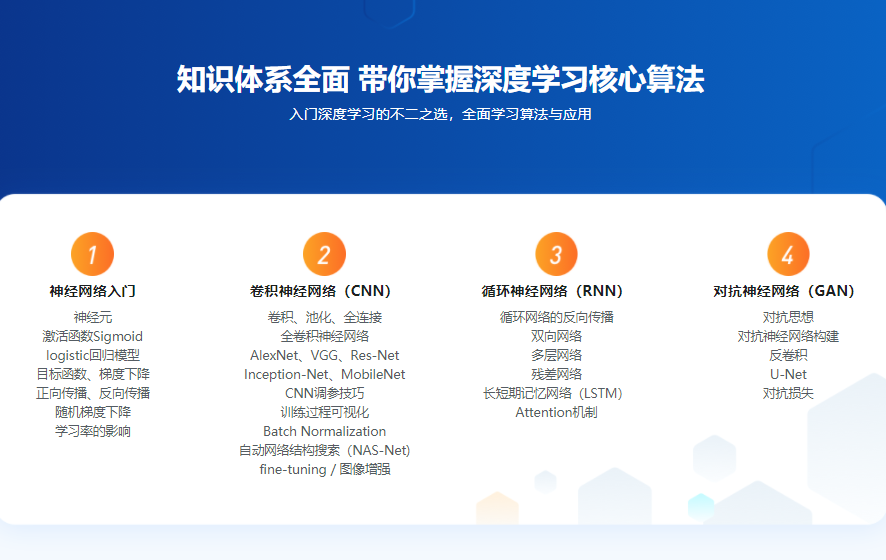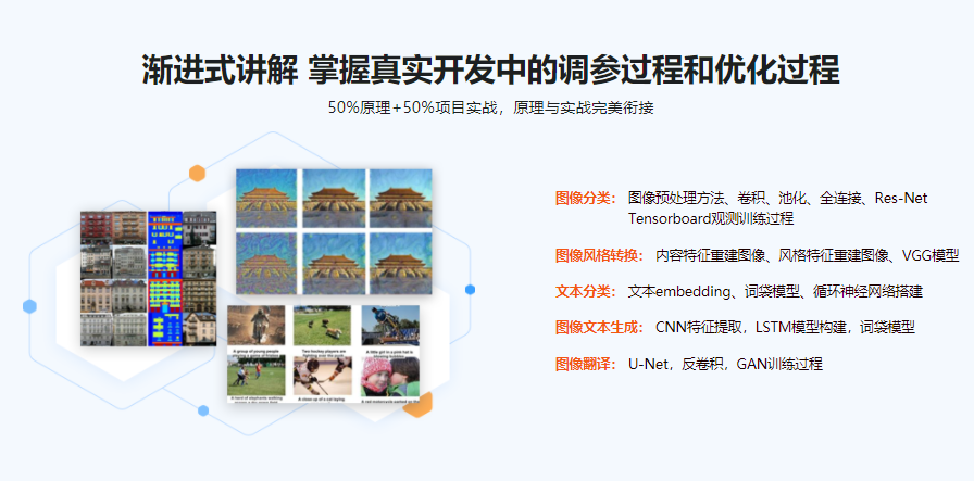 本课程运用原理讲解加实战的方式学习卷积神经网络(CNN)、循环神经网络(RNN)、对立神经网络(GAN),经过图画分类、文本分类、图画风格转化、图画文本生成、图画翻译等项目,深度把握算法调参以及运用Tensorflow进行编程的能力。