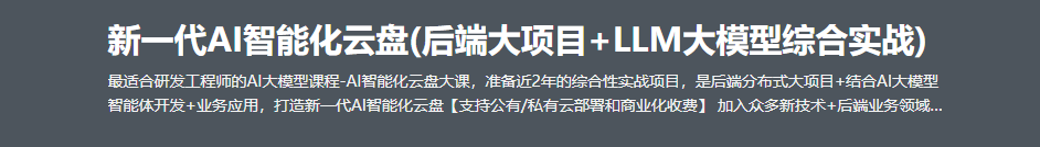 在AI驱动产业变革的时代,传统云盘已无法满足智能化文件管理需求。本课程以**商业级AI云盘系统**为载体,深度融合后端分布式架构与大模型技术,培养学员开发具备“认知能力”的企业级智能存储平台。课程对标阿里P7+技术能力,覆盖从需求分析、架构设计、代码开发到LLM集成与性能优化的全流程,解决企业文档智能处理、跨模态检索、自动化知识管理等核心需求。