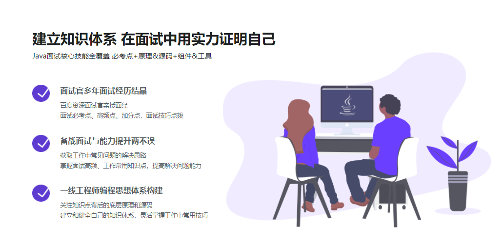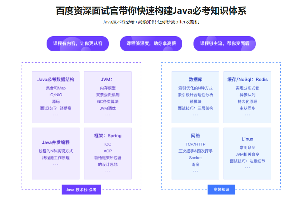 本课程中,百度资深面试官带你剖析Java面试流程,遍历Java面试知识技能,让你更高效更全面的进行面试准备。课程内容包含Java面试必考点、高频点、加薪点。课程不变的初心是为了帮你省时省力准备面试,让你面试如虎添翼,让高薪工作纷至沓来。