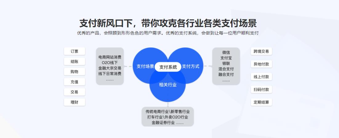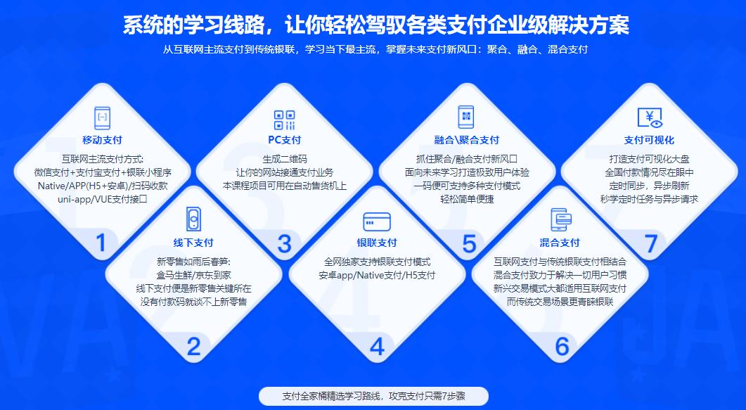 带你实战移动端、PC端、H5等多终端支付系统,对接各类真实业务系统,如外卖、电商、订票等各行业的业务系统,并支持微信、支付宝、银联、融合支付、混合支付等多种企业级支付模式,