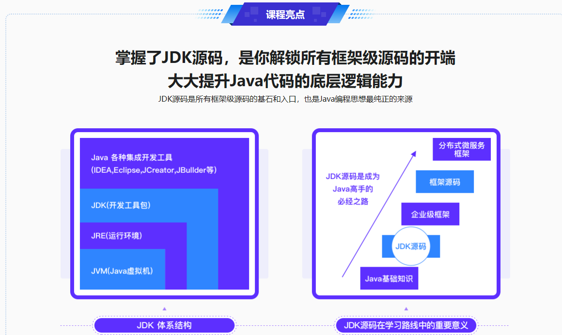 JDK是Java开发工具包,包含了编译、运行、调试等关键命令。其核心是Java API的预定义的类库,这些对开发人员说是必备技能。课程内容全面,知识覆盖面超全,结合实际案例手把手式教学,助你系统性掌握JDK底层源码,大牛设计思想,在工作中游刃有余。