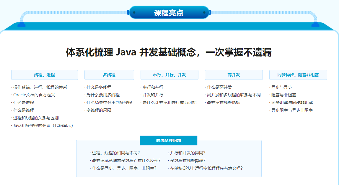 并发是程序员永恒的命题。并发易学难精,没有稳扎稳打的第一步,前路坎坷易弃坑。本课程涵盖线程、进程、多线程、并发、高并发、同步、异步、阻塞、非阻塞等,带大家快速构建清晰的理论基石。另有高频面试点拨,让你学懂、会用。