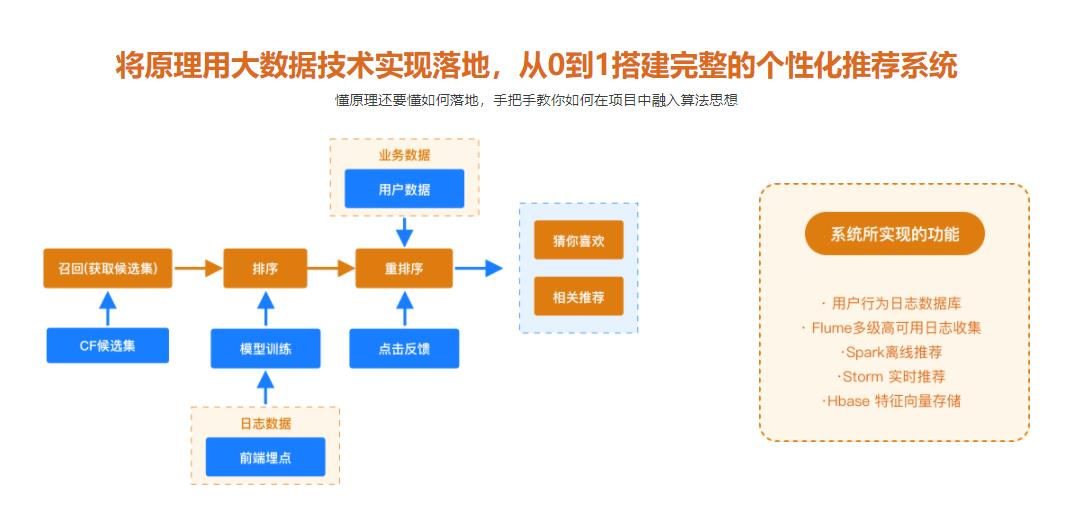 课程结合算法原理,利用Spark 2.x 和主流技术栈,通过Flume多级高可用日志收集用户行为,使用HBase特征向量存储,利用算法原理结合Spark和Storm进行离线和实时推荐,实现图书电商场景下的个性化推荐系统。