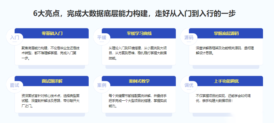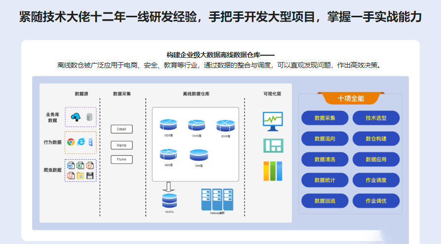 大数据在互联网与工业领域的价值不用赘言,随着人工智能、区块链等技术越来越火热,许多企业也加入了大数据的“抢人大战”。大数据技术栈众多,学习曲线陡峭,为了更好地帮你入门,我们将从大数据基石——Hadoop讲起,过渡到Hive,一步步掌握数仓、数据处理、离线开发等关键技能点,并最终通过一个大型项目的实战,带你进入大数据的世界!数千小时授课时长,众多学员口碑选择
