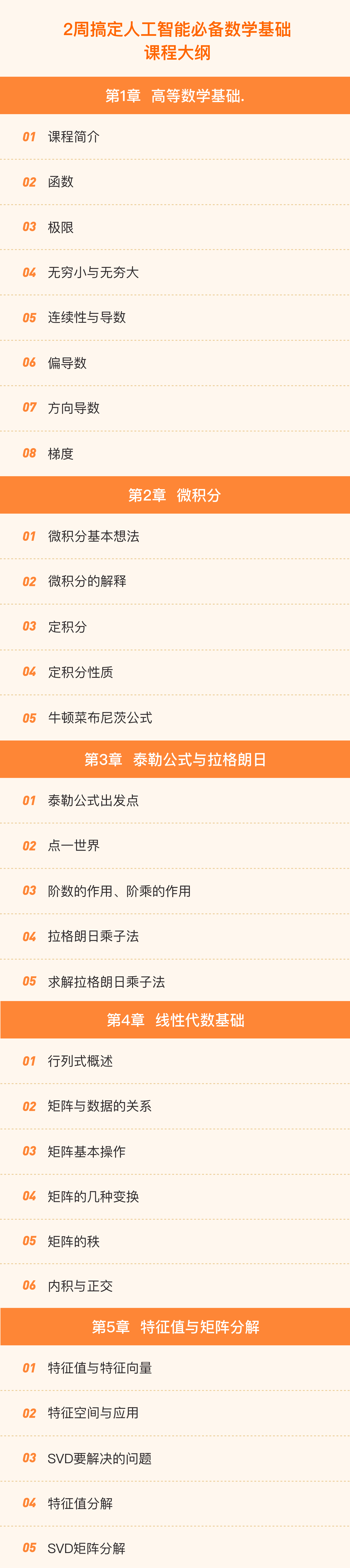 数据科学与人工智能必备数学基础课程旨在帮助同学们快速打下数学基础,通俗讲解其中每一个知识点。课程内容涉及高等数学,线性代数,概率论与统计学,同学们在学习过程中应当以理解为出发点并不需要死记每一个公式,快速掌握核心知识点。