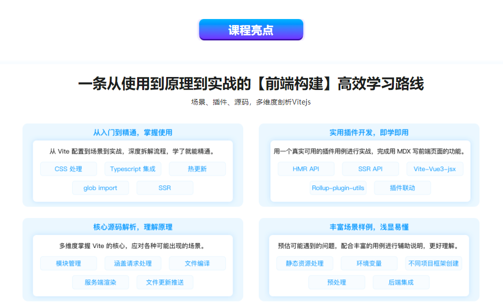 Vite 因为其跨前端框架的能力和极其优越的性能,被称为下一代前端构建工具。如果你想在未来几年有更好的发展空间,那么最好尽早学会 Vite。 我们将从如何配置使用入手,深入到Vite的场景、插件以及源码,帮助大家系统掌握 Vite,全面提升对前端构建的认知,更能自行构建项目,为进阶前端架构师打下坚实的基础。