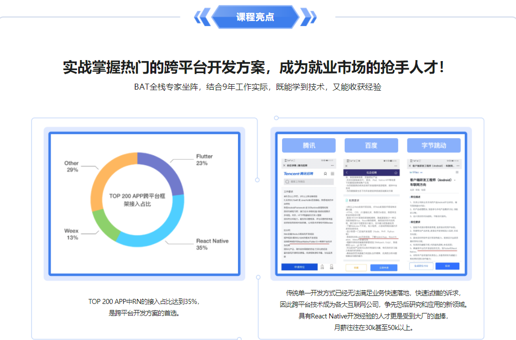 本课程将带你解锁React Native开发应用新姿势,一网打尽React Native新版本热门技术;课程中老师会手把手带你开发并打包上线一款完整的跨平台App;让你拥有一次真正参与上线项目开发的历程,同时全面掌握React Native核心技术,让你的技术能力和项目经验都得到前所未有的提升!【技术储备要求:1.具备JavaScript、ES5,ES6,React 前端基础;2.具备ReactNative技术基础(语法,环境搭建);3.了解XCode、AndroidStudio开发工具使用】