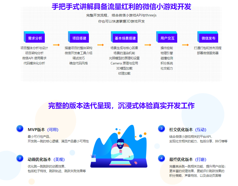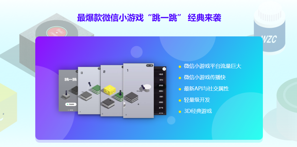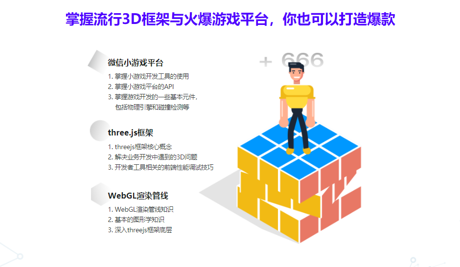 通过使用three.js开发“跳一跳”微信小游戏,以高仿真的实战授课模式,带你深入学习微信小游戏API、three.js框架、webgl的核心概念、让你了解微信小游戏以及移动端的3D Web游戏是如何开发的,掌握这一类移动端3D小游戏的实现和性能优化