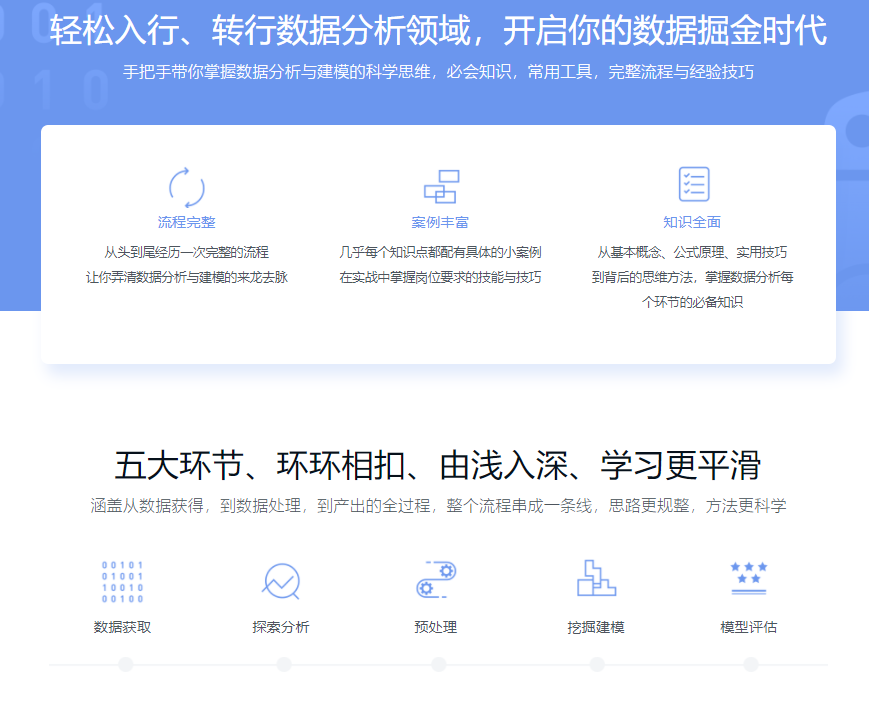 数据分析与挖掘行业火爆,人才稀缺。本课程基于Python3全程以真实案例驱动,带你学习数据分析与挖掘建模领域的科学思维、必会知识、常用工具、完整流程以及老师多年的经验技巧。助你逆袭成为数据掘金时代的抢手人才!