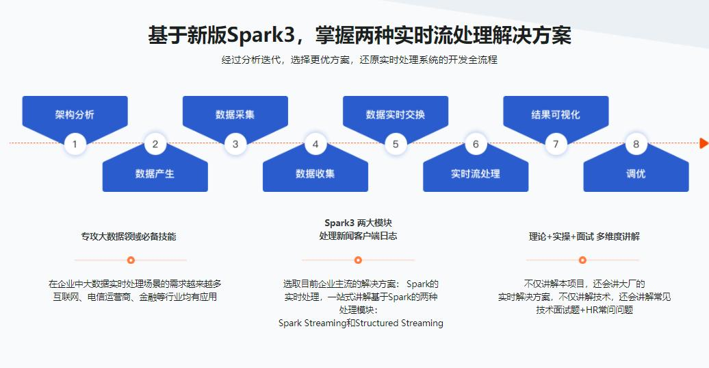 基于Spark3,在同一项目中,学习两套实时处理的解决方案:Spark Streaming和Structured Streaming,体验完整实时处理方案的全流程,为你梳理大数据常见面试题、大厂的实时解决方案,带你跨过面试最后一公里。