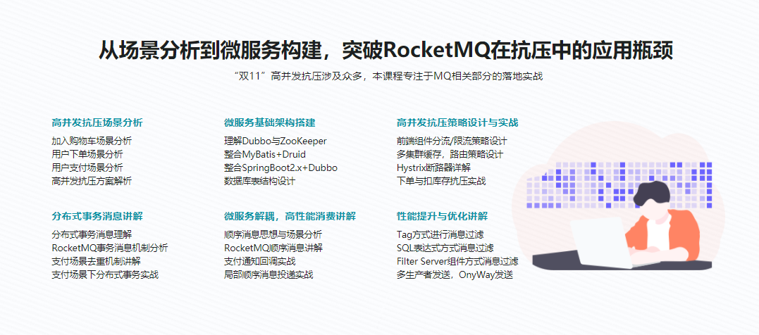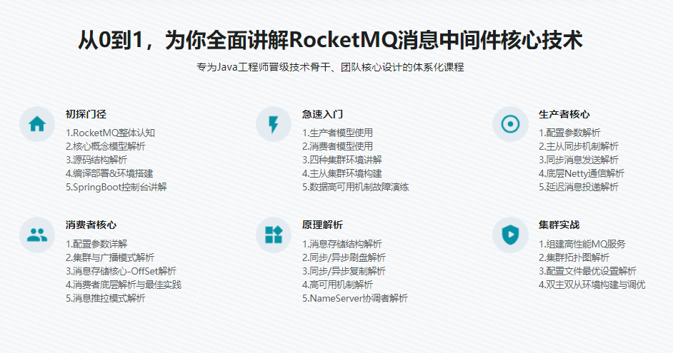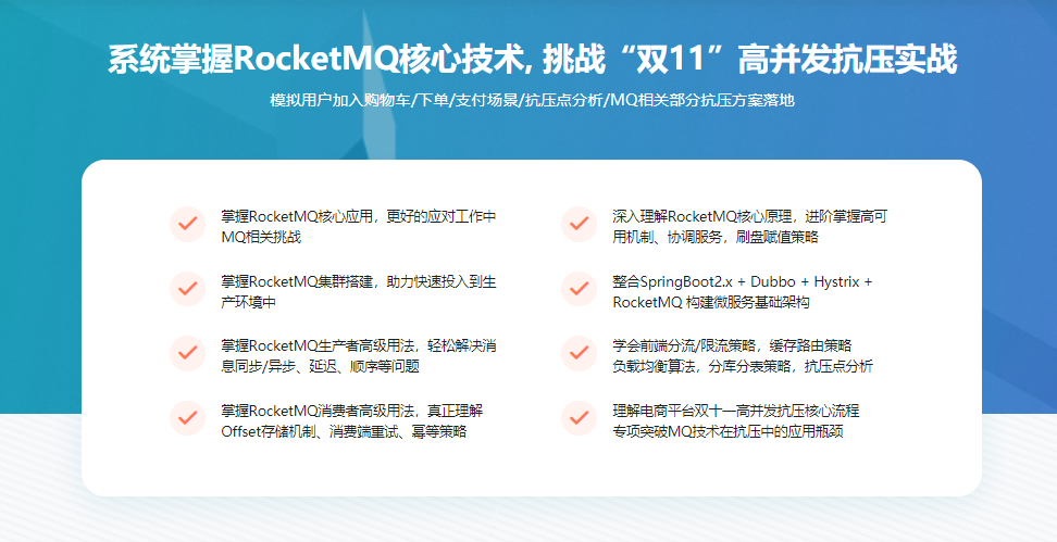 课程带你急速入门RocketMQ,然后进阶讲解RocketMQ,掌握RocketMQ核心知识。通过经典电商场景对MQ部分进行实战落地,专项突破MQ技术在抗压中的应用瓶颈,最终能够彻底掌握RocketMQ在实际工作中的应用。
