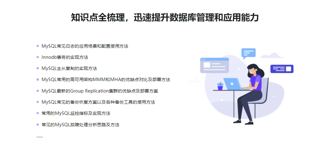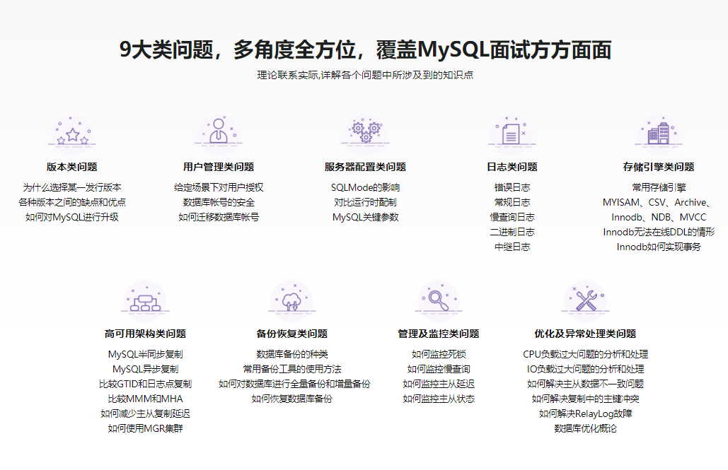 本课程以MySQL8.0版本为基础,覆盖MySQL面试相关的9大类问题,梳理和总结相关知识点。通过本课程的学习,可以使你紧跟MySQL发展的脚步,学习到最新的MySQL知识,轻松的完成MySQL 的相关面试,助力获得心怡的工作机会!