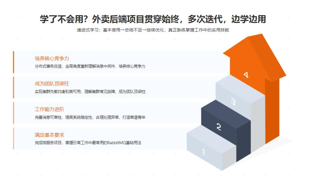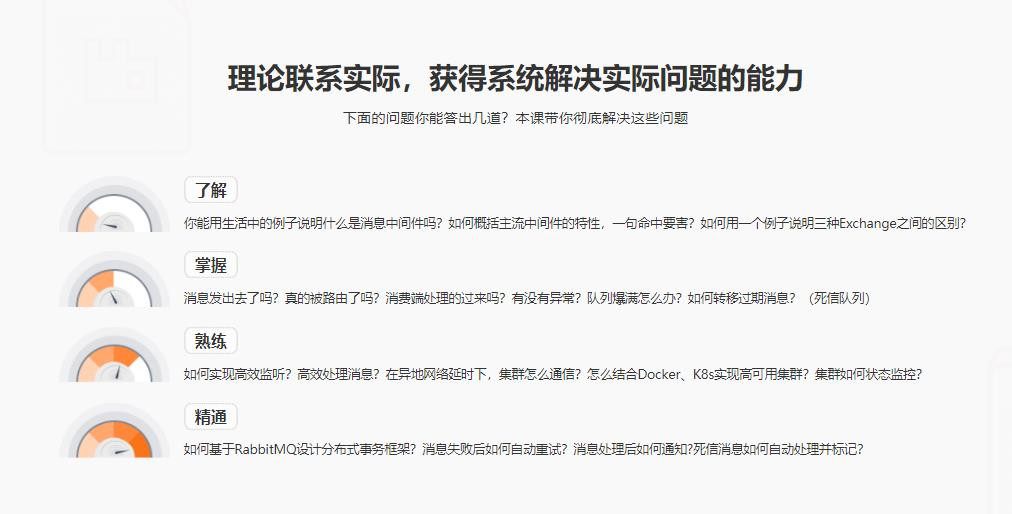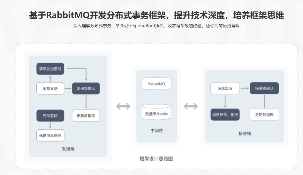 本课从入门到精通,全程用项目递进的方式讲授知识。课程中还融入了很多开发小Tips,并且把深度做足:解读核心源码,基于RabbitMQ二次开发,手写分布式事务框架,提升技术深度,培养框架思维。